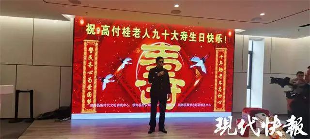 2 月 10 日下午 2 点,老人的生日庆典在滨海县新时代文明实践中心 5 楼新风堂厅举行。现代快报记者在现场看到," 十年助老不忘初心,警民齐心为爱圆梦 " 的红色对联非常醒目。王龙恩组织了社区干部、圆梦爱心志愿者,一同为高付桂老人献上一台精彩的 90 岁生日庆祝活动。
