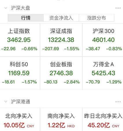 截至收盘,沪指跌0.66%报3462.95点,深成指跌1.55%报13224.38点,创业板指跌2.84%报2746.38点,上证50指数涨0.83%;两市合计成交9915亿元,北向资金净买入10.05亿元。