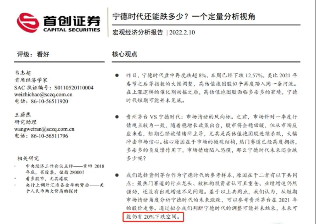 首创证券首席经济学家发文称,宁德时代的股价自高点回调的幅度也不小了,是否跌到位是当下最为关键的问题。现在的问题是,宁德时代还会跌吗?还能跌多少?报告认为,从短期市场情绪角度分析宁德时代的未来涨跌,可以参考贵州茅台在2021年的股价走势。通过拟合可以判断宁德时代的调整可能并未结束,未来可能仍有20%下跌空间,建议卖出。