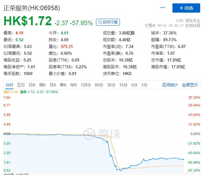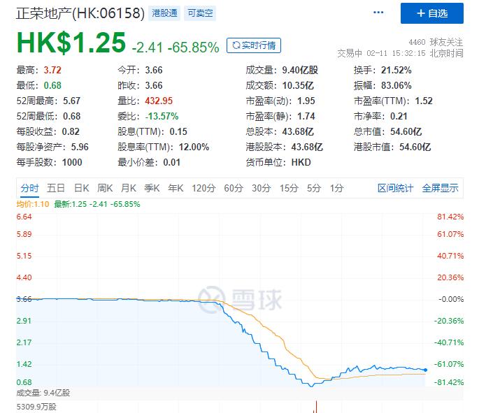 2月11日午后,港股上市公司正荣地产、正荣服务盘中闪崩。其中。正荣地产盘中一度跌超80%,创最大跌幅纪录,总市值从160亿港元跌至29.7亿港元;正荣服务也一度跌逾85%。