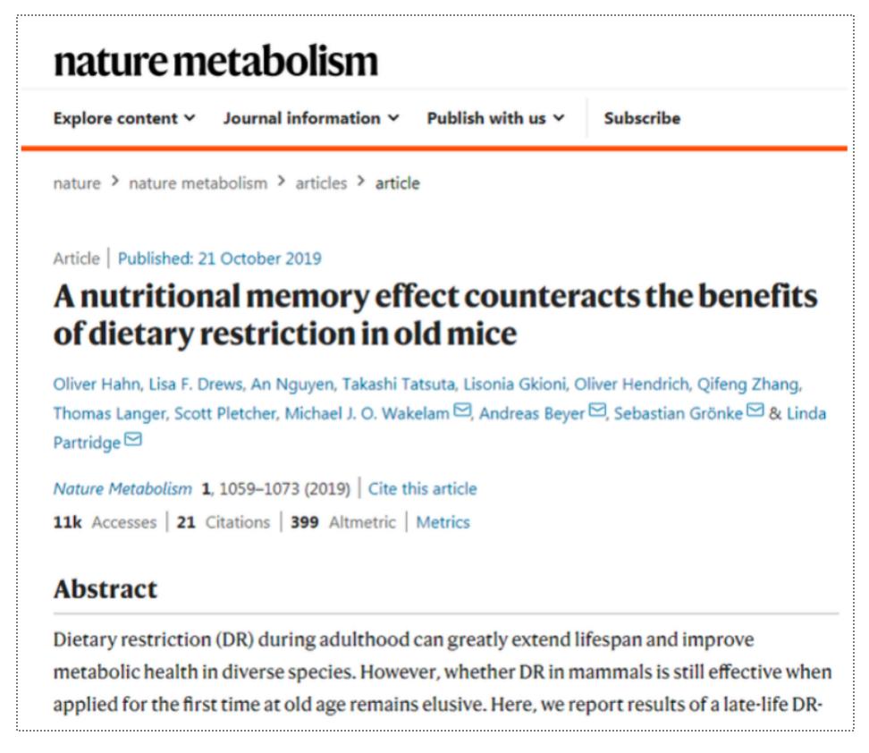①1.Hahn O, Drews LF, Nguyen A, et al. A nutritional memory effect counteracts benefits of dietary restriction in old mice. Nat Metab. 2019;1(11):1059-1073. doi:10.1038/s42255-019-0121-0