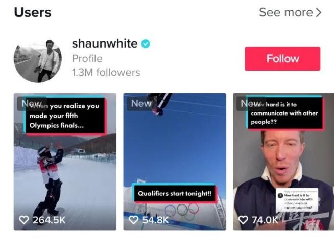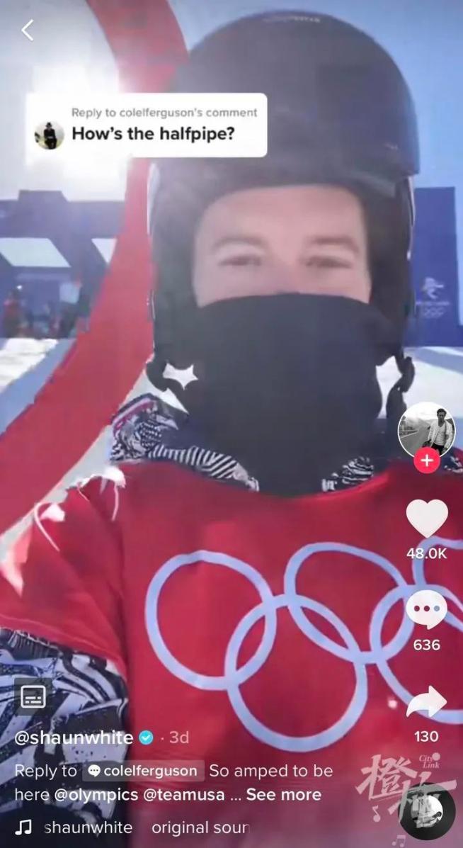 早在出发北京之前,肖恩·怀特就在他的Tiktok上发布了大量关于冬奥的视频。肖恩·怀特在Tiktok上拥有超过百万的粉丝,每条发布的点赞评论量更是见证了这位传奇运动员不仅仅是体育场上的巨星,也是社交媒体的宠儿。