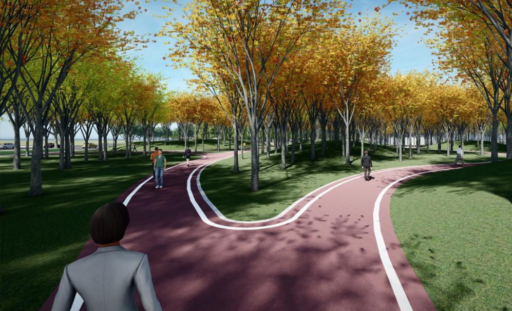 方案采用“疏林草地”的设计手法,将榉树、水杉、草坪等进行科学搭配,场地设游园步道、休憩设施、活动设施、公厕、林荫停车场等,在提供市民就近活动场所的基础上缓解部分交通拥堵。