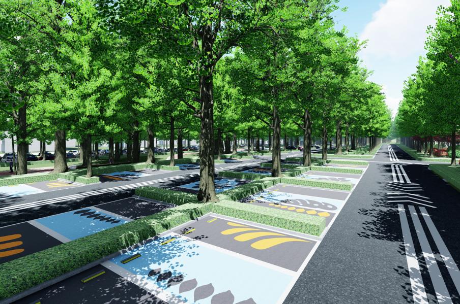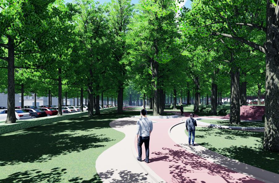 方案以银杏为骨干树种,建造247个车位的生态停车场,将停车空间与园林绿化空间有机结合,兼顾停车与生态绿化双重功能。同时,结合周边环境,合理设置休憩设施、公厕等服务项目。