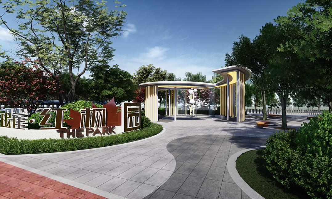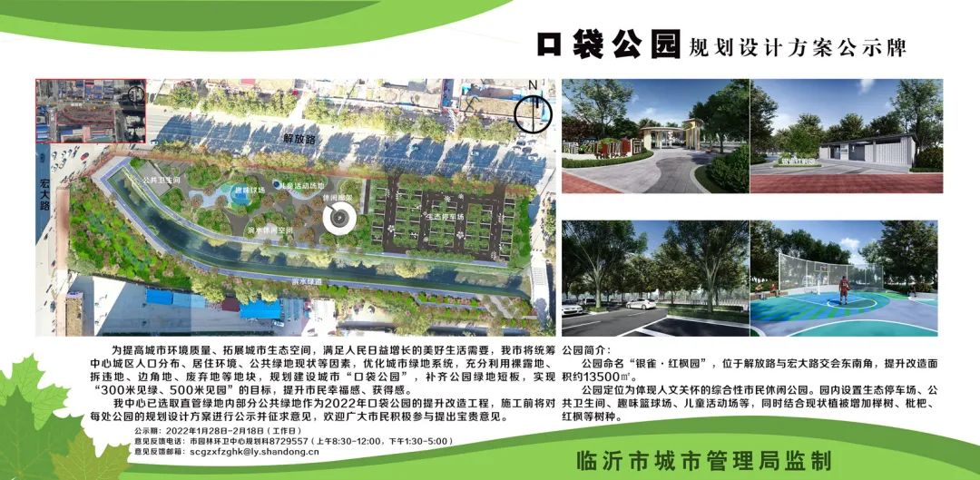该公园命名为“银雀·红枫园”,位于解放路与宏大路交会东南角,提升改造面积约13500㎡。