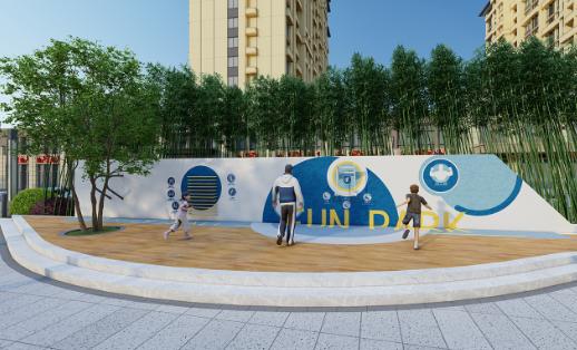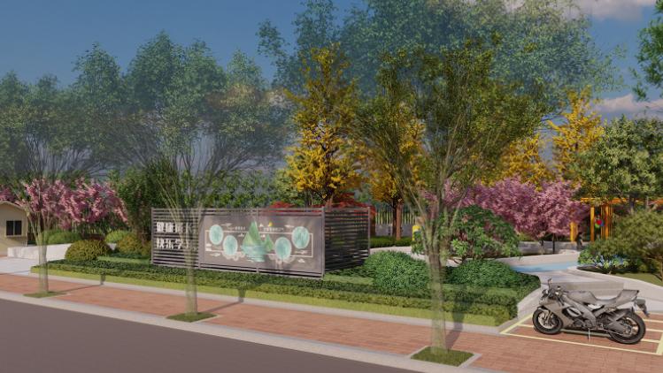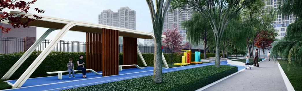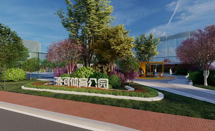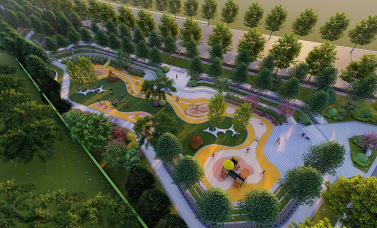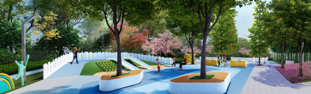 公园设计定位为趣味运动主题,设置羽毛球场、儿童乐园、乒乓球场地、生态停车场、公共卫生间等,为居民提供休闲运动场地,同时增加榉树、乌桕、白蜡、樱花、海棠等植被。