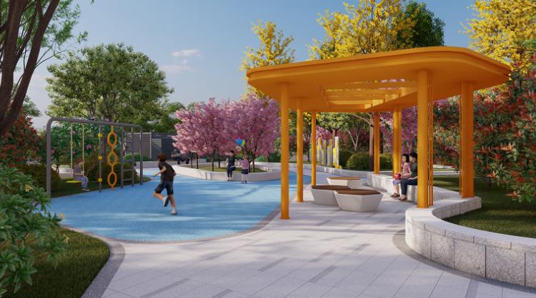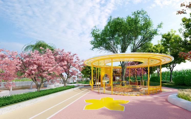 公园依托现状植被条件,增植早樱、晚樱、染井吉野樱等混合种植,形成主题樱花园。园内设儿童游戏场地、休闲小广场、廊架、公厕等,为周边居民提供游赏兼具的休闲绿地。