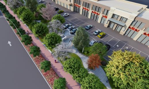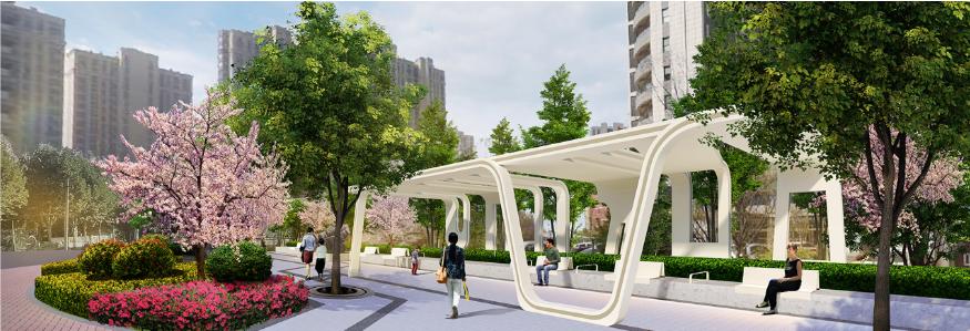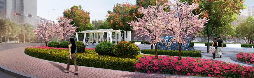 公园位于道路平交口,结合周边商铺,定位为现代艺术商业绿地和现代休闲绿地。设置廊架、布置休闲座椅,增加早樱、夏鹃等开花植物,提升城市色彩。