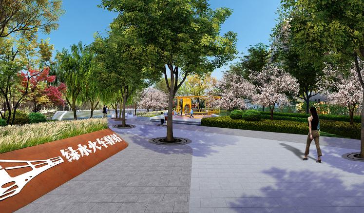 公园设计定位以火车文化为主题。公园设置有卫生间、活动广场和复合型活动场地。保留现状柳树、玉兰,增加樱花、榉树等。