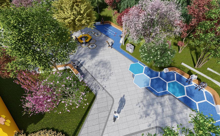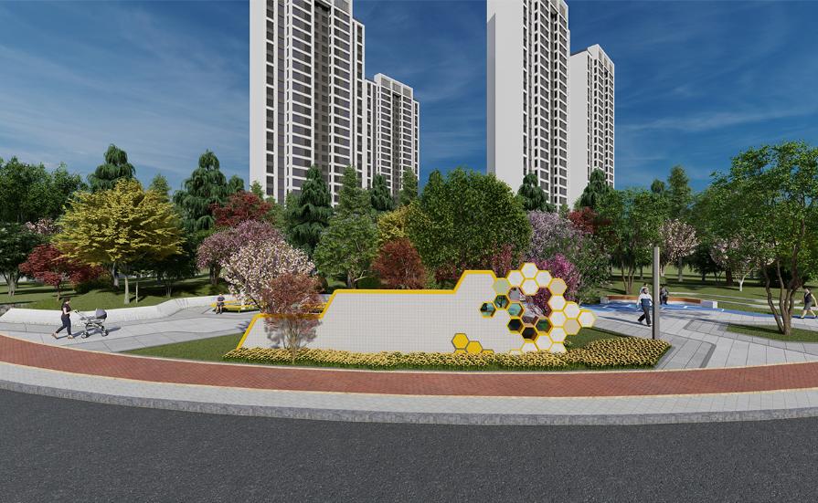 公园以蜂巢元素为设计主题,旨在打造如同蜂巢般稳固安心的公共景观空间,公园内部设休闲小广场、主题景墙、廊架、坐凳、公厕等,营造实用性与趣味性兼具的游憩空间。