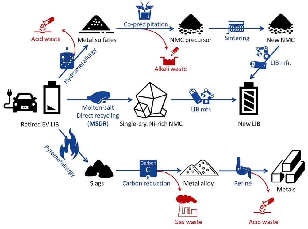 图1. 火法回收、湿法回收、熔融盐直接回收法(本工作)流程比较示意图
