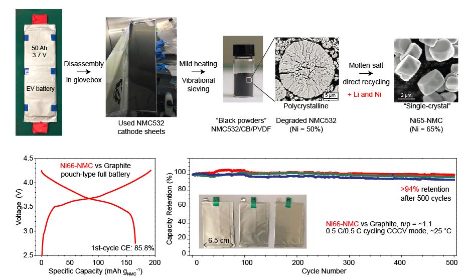 图2. 通过熔融盐直接回收法从废旧低镍多晶三元正极制备高镍单晶正极的过程及其电化学性能