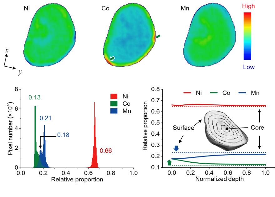 图3. 同步辐射Nano-XRF方法研究熔盐回收获得的单晶正极材料中的元素三维分布结果及分析
