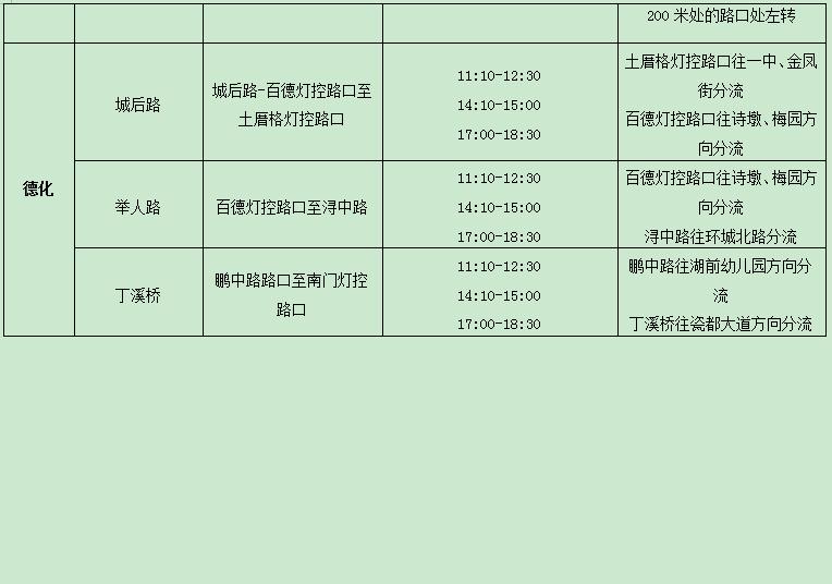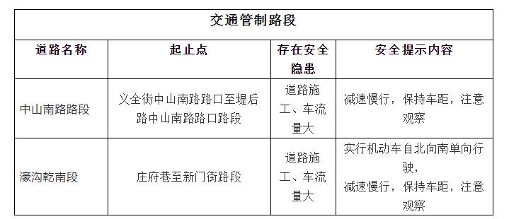 根据道路实际交通流量对西街、东街、南俊路、百源路、新门街、涂门街、新华路连接形成的闭合区域内的路段进行适时交通管制,管制期间禁止一切车辆(含非机动车)通行。以上区域周边道路交通流量达到饱和后,将对区域外的路段进行适时交通管控分流。