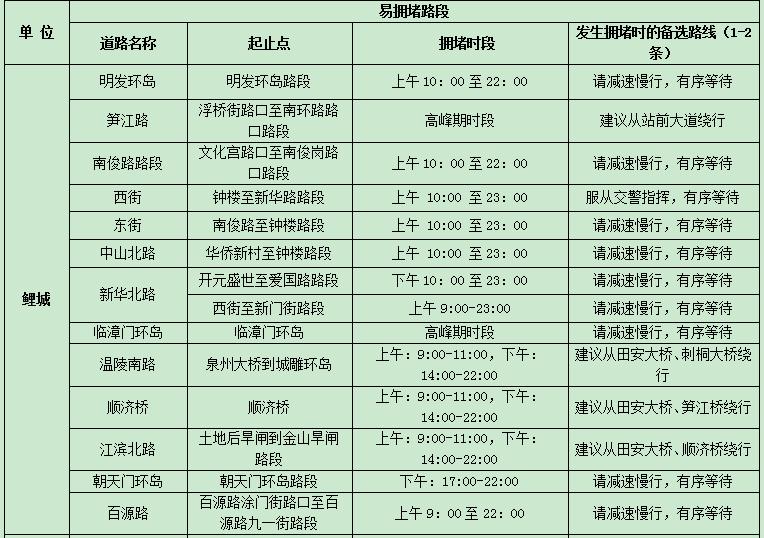 元宵期间部分易拥堵路段