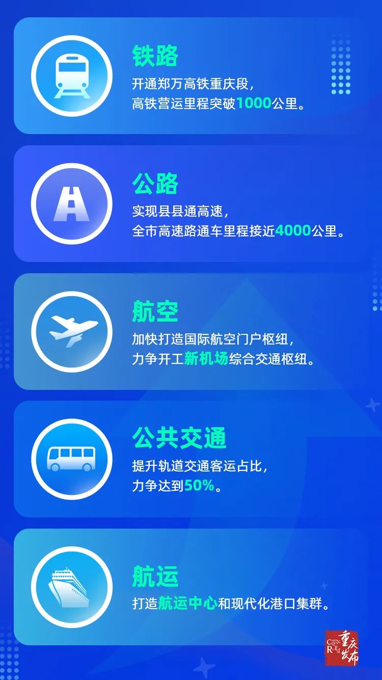 ●全力推进成渝中线、渝万、渝昆、成达万、渝湘高铁重庆至黔江段等项目,完成渝万城际铁路提质改造、实现时速250公里达速运行。