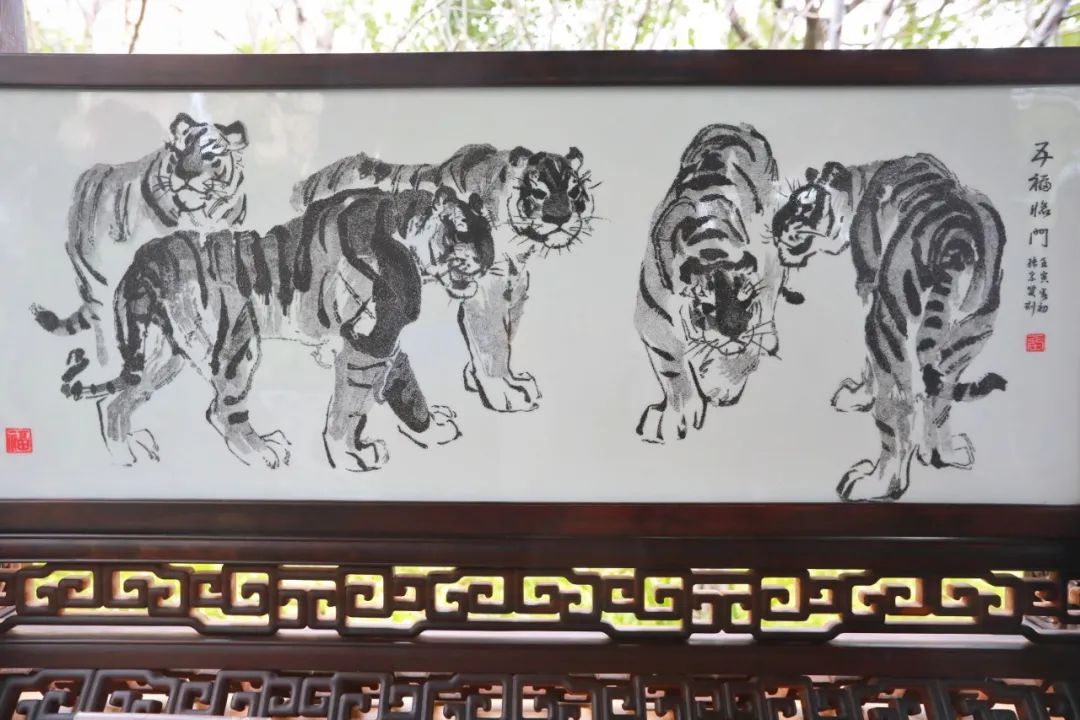 其中,1.2米长的瓷刻作品《五福临门》尤其显眼,刻画的是谐音“福”的五只老虎,轮框线条又颇具水墨风味。“五只老虎我刻了一个多月,还是蛮吃功夫的。”瓷刻的市级传承人张宗贤是三林当地人,研习这门非遗技艺已近半个世纪。他介绍,国画讲究墨分五色,而瓷刻就是以刀代笔,通过刻痕的疏密程度,来模拟墨色的浓淡。