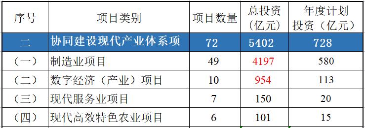 其中,现代基础设施网络项目金额最多达13461亿,占总投资额66%。其次是现代产业体系项目、科技创新中心项目,分别为5402亿元、750亿元,占比26%、4%。