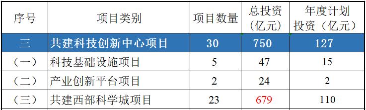 共建科技中心板块更是直接和科技产业相关,成渝列出了30个共计750亿元的项目。其中,占比重最大的可以说是备受瞩目的“西部科学城”项目,这是将成都和重庆既有科学城及周边科技园区项目的整合,投资金额达到679亿元,占科技中心建设总金额的91%。