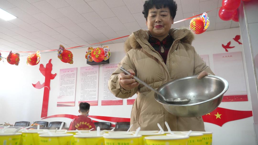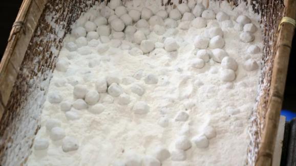 一块块元宵馅料在簸箕中“打滚翻飞”