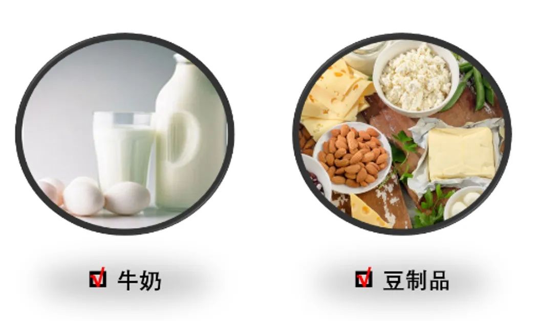 鉴于我国人群一般饮食中含钙量较低,推荐通过饮用牛奶或摄取钙剂来增加钙摄入量,牛奶中还有维生素D,有助于提高钙的利用率。建议每天至少饮用300ml牛奶,外加豆制品、带壳食物、深绿色蔬菜食物等其他富含钙的食物以满足机体需求。