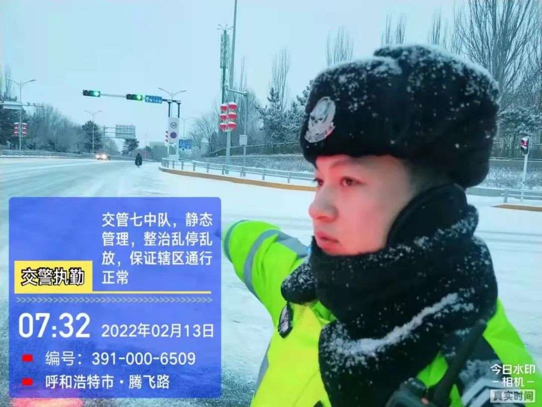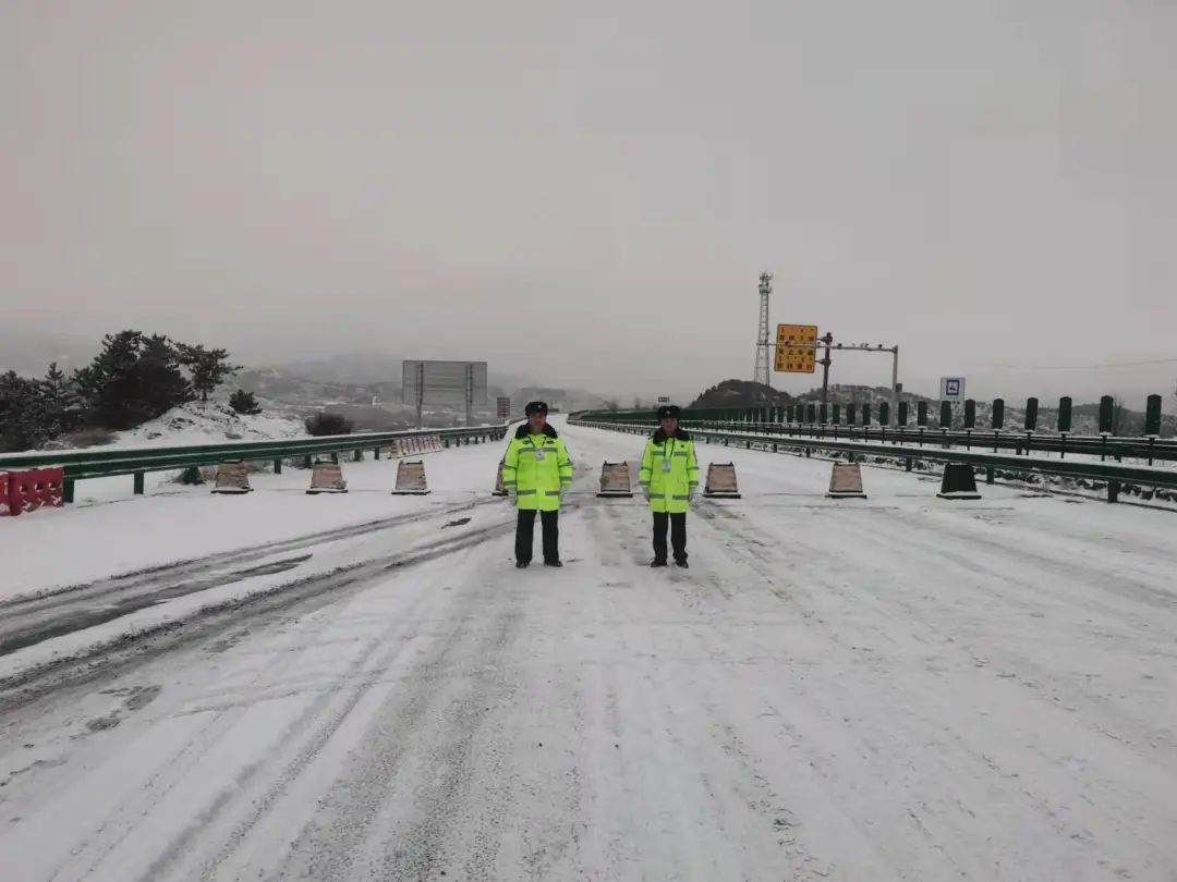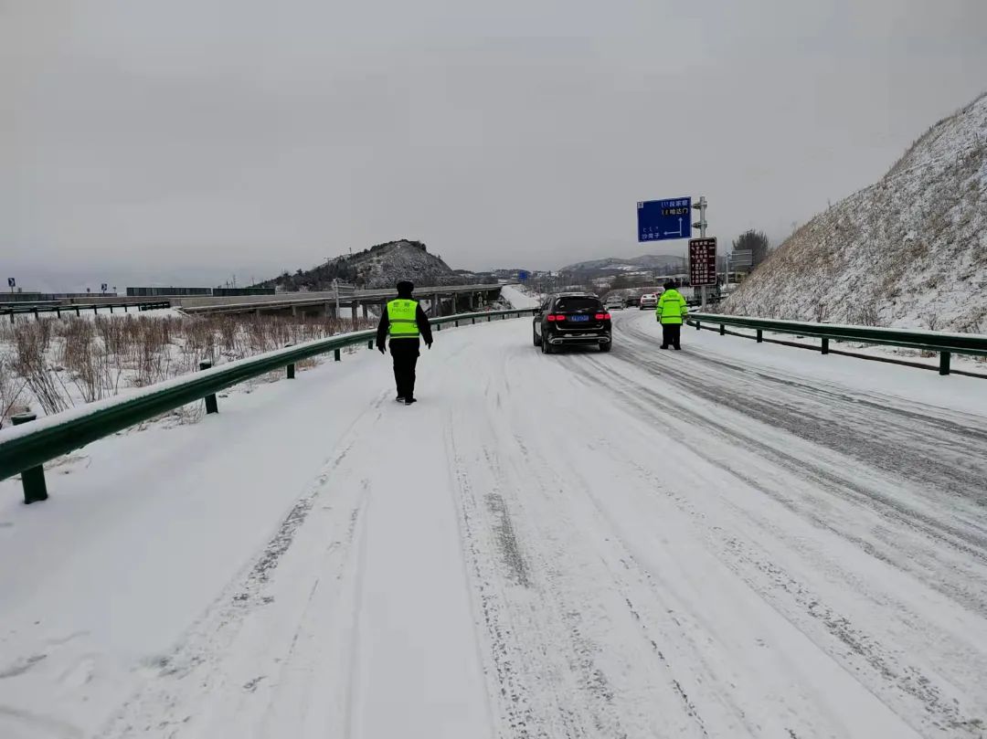 (2022年2月13日,呼和浩特交管回民大队G209国道公路辖区受恶劣天气影响,降雪量大,启动应急措施,暂时封闭G209上行线,疏导分流劝返所有车辆。)
