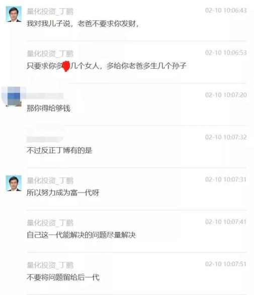 先看一下大致内容,丁鹏在群聊中称,“我对我儿子说,老爸不要求你发财,只要求你多X几个女人,多给你老爸多生几个孙子。”