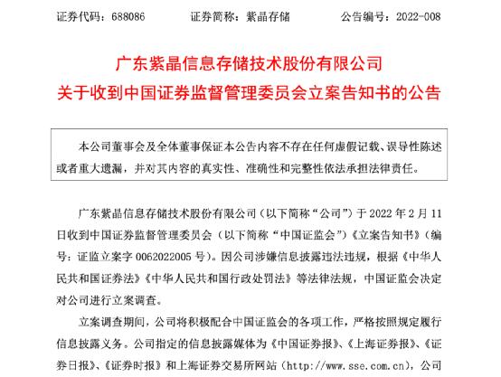 2月11日晚间,紫晶存储公告称,公司当日收到中国证监会立案告知书。因公司涉嫌信息披露违法违规,根据《中华人民共和国证券法》《中华人民共和国行政处罚法》等法律法规,中国证监会决定对公司进行立案调查。
