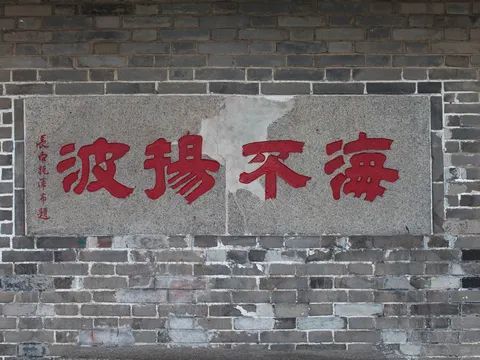 “海不扬波”四个字是清朝山东巡抚托浑布书写的。大家稍有留意就可以发现,这四个字中的“不”字是经过修补的。这是有一些来历的。1840年,鸦片战争爆发,山东巡抚托浑布来到蓬莱督办海防。当他登上蓬莱阁,面对一望无际的大海,无限感慨,挥笔写下了“海不扬波”四个字,表达了他希望万里海疆平安无事的心境。可是历史却偏偏与他开了一个玩笑。五十年后的1894年,甲午战争爆发,战火蔓延到了蓬莱。1895年1月18日,日舰炮击蓬莱城,一颗炮弹不偏不倚正好击中这方石刻,幸好是一颗哑弹,只是穿墙而过把大半个不字打飞但没有爆炸,也许是有楼上八仙保佑的原因吧,主阁得以幸免,但是“海不扬波”石刻却从此变成了“海扬波”。事实证明,没有强盛的国家和强大的海防,“海不扬波”的愿望只能是一种幻想。