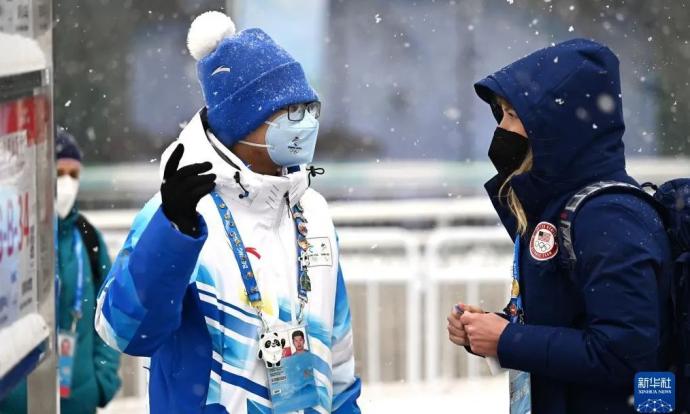 北京冬奥会志愿者为一名外国工作人员提供咨询服务。新华社记者 李贺 摄
