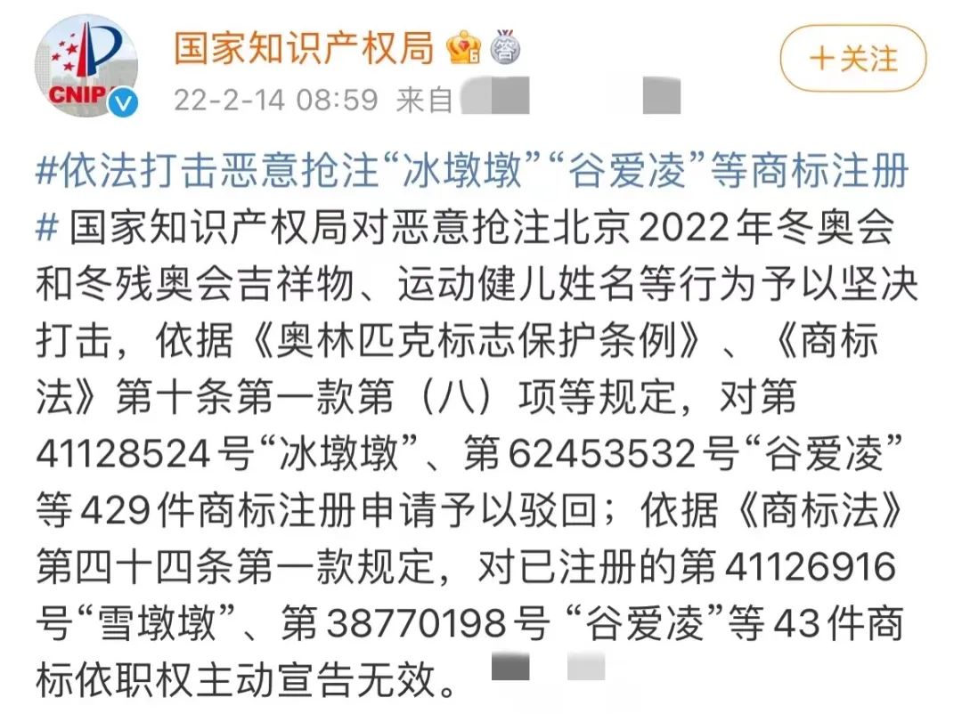 国家知识产权局今天(14日)发布通告,依法打击恶意抢注“冰墩墩”“谷爱凌”等商标注册。国家知识产权局依据《奥林匹克标志保护条例》《商标法》第十条第一款第(八)项等规定,对第41128524号“冰墩墩”、第62453532号“谷爱凌”等429件商标注册申请予以驳回;依据《商标法》第四十四条第一款规定,对已注册的第41126916号“雪墩墩”、第38770198号 “谷爱凌”等43件商标依职权主动宣告无效。