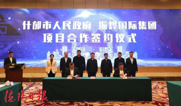 2月14日下午,什邡市人民政府与振烨国际集团项目合作签约仪式在旌湖国际酒店举行,标志着振烨(什邡)高性能电子信息新材料产业园项目正式落户。市委副书记、市长刘光强,振烨国际集团党委书记、董事局主席林烨出席仪式并致辞。