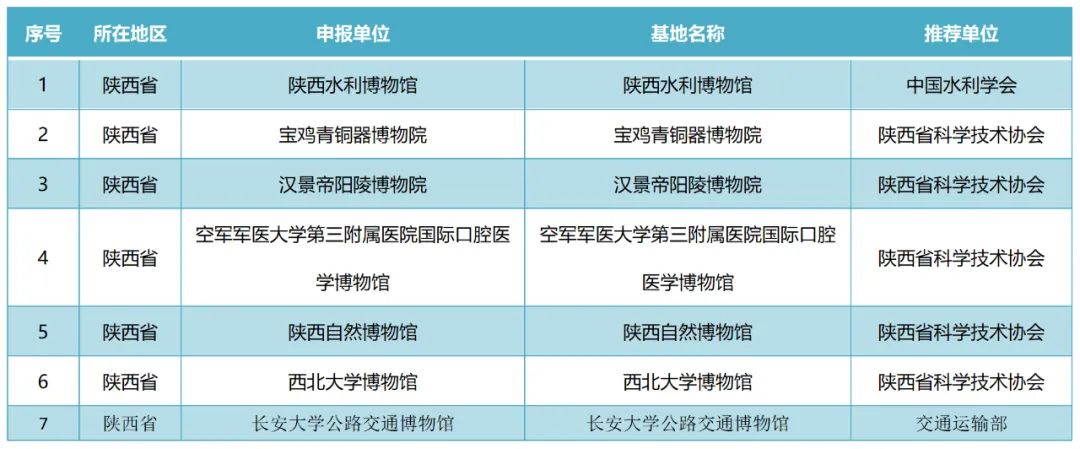 陕西共有7家博物馆被认定为全国科普教育基地,其中5家位于西安市,分别是汉景帝阳陵博物院、空军军医大学第三附属医院国际口腔医学博物馆、陕西自然博物馆、西北大学博物馆、长安大学公路交通博物馆。