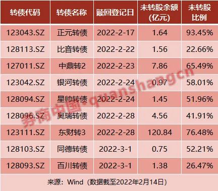 具体来看,正元转债将于2月17日迎来赎回登记日。2月22日为比音转债赎回登记日。2月23日为中鼎转2赎回登记日,2月24日,银河转债、星帅转债迎来赎回登记日,2月28日,又有奥瑞转债、东财转3进入转股或卖出最后一天。3月1日,同德转债、百川转债等可转债迎来赎回登记日。