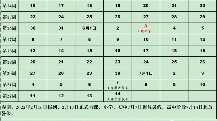 (二)中学2022年2月18日教师返校,2月19日学生报到注册,2月21日正式行课,到7月15日结束,共计二十一周(含复习考试和学校机动时间)。暑假从2022年7月16日开始到8月25日结束。