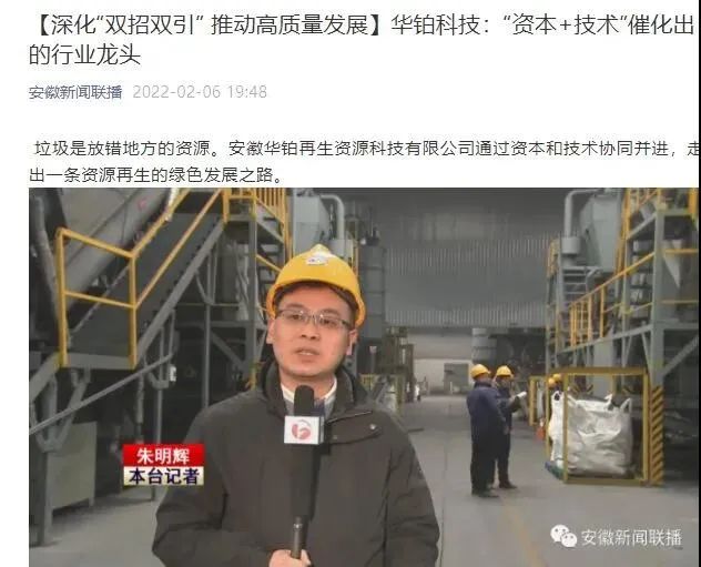 《安徽新闻联播》播出《深化“双招双引” 推动高质量发展 华铂科技:“资本+技术”催化出的行业龙头》,介绍了界首市积极融入长三角一体化发展战略,推进“双招双引”工作,打造资源再生产业集群促进县域经济高质量发展的事例。