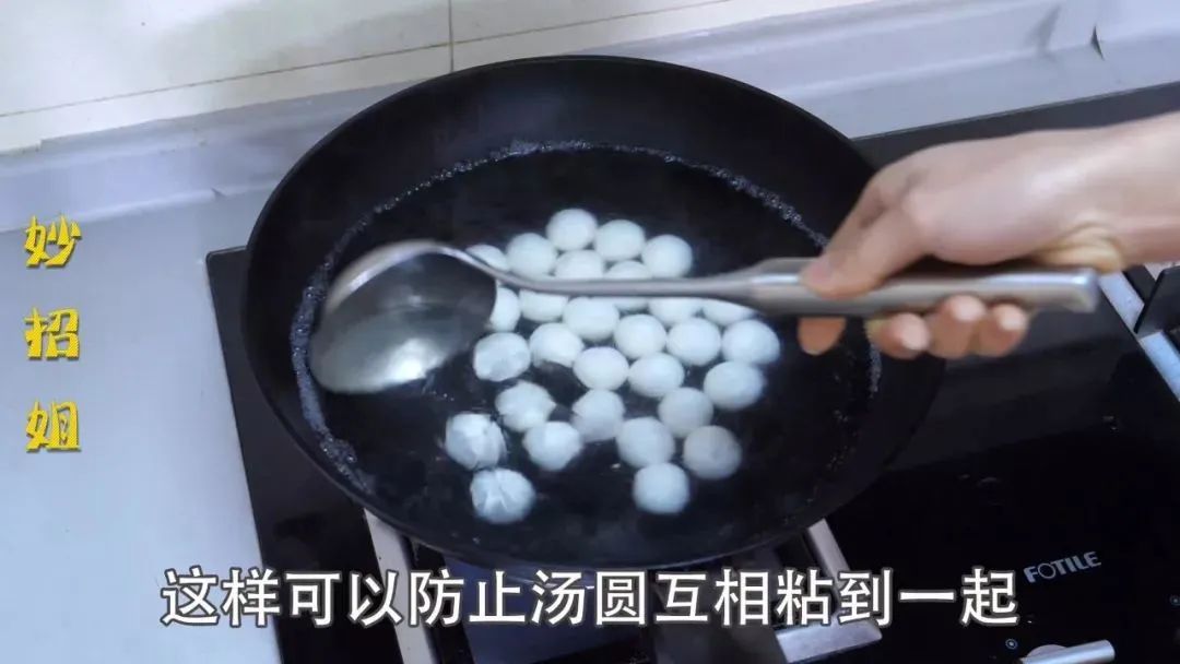 汤圆倒入之后再用勺子的背面推水,这样可以防止汤圆互相粘到一起或者粘到锅底。