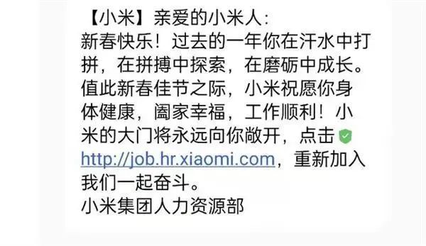 不仅如此,此前小米的离职老员工近日还收到短信消息称小米的大门永远敞开,欢迎重新加入小米一起奋斗。