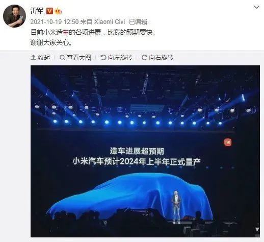 2021年10月,雷军曾在微博上透露,小米汽车预计在2024年上半年正式量产。“目前小米造车的各项进展,比我的预期要快。”