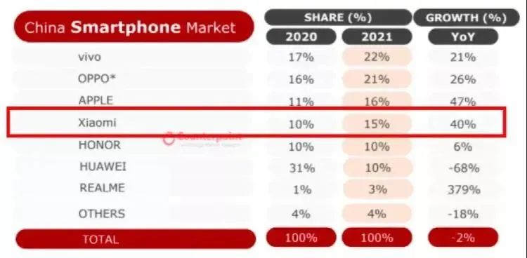 此前,Counterpoint发布2021年四季度国内手机市场销量报告,小米排名第五,销量同比下滑8%。从2021全年的数据来看,vivo在中国市场排名第一,OPPO排名第二。苹果排名第三,销量同比增速达到47%,是前五大厂商中最快的。小米和荣耀分别位居第四和第五。