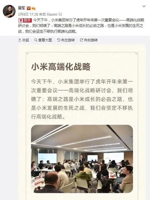 就在上周,雷军在微博发布消息称,2月8日下午,小米举办了虎年开年来第一次重要会议——高端化战略研讨会。他强调,高端之路是小米成长的必由之路,也是小米发展的生死之战,会坚定不移执行高端化战略。