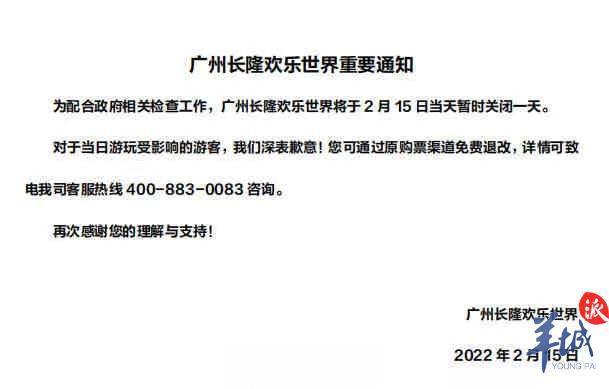 2月15日,广州长隆旅游度假区官方微博“广州长隆”发布通知:为配合政府相关检查工作,广州长隆欢乐世界于2月15日当天暂时关闭一天。