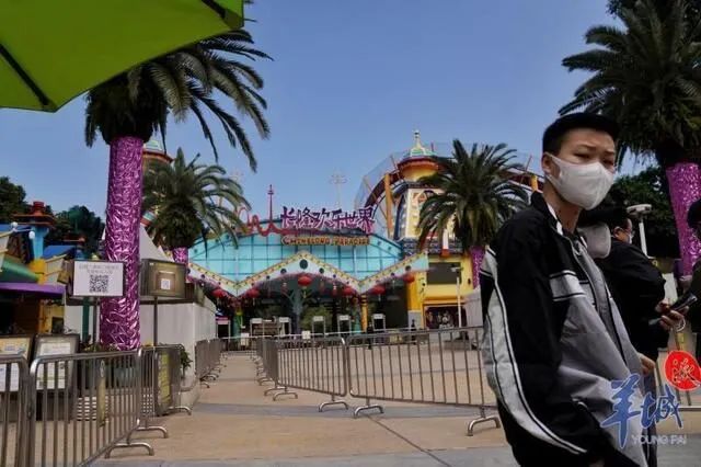 现场工作人员告诉记者,由于疫情防控需要,接政府通知,广州长隆欢乐世界今天闭园一天,“今天上午10点左右,我们接到番禺区政府通知,长隆欢乐世界园内人员都需要做核酸检测,现场有几百人,下午1点钟已做完了核酸检测,下午准备进行全园消杀”。