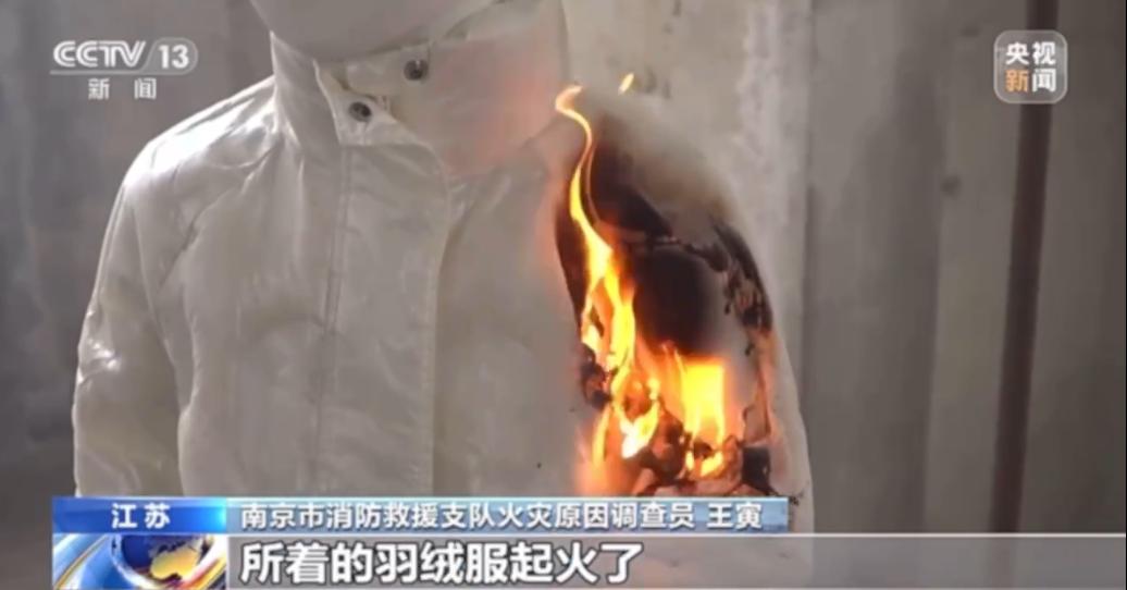 烟花喷溅出的火星,溅到了我们的衣物上以后,尤其像我们的羽绒服,极易烫出来一个个洞,同时它的热量会导致衣物起火。能看到这时候小孩身上所着的羽绒服起火了,这个时候对我们孩子的生命安全造成了极大威胁。