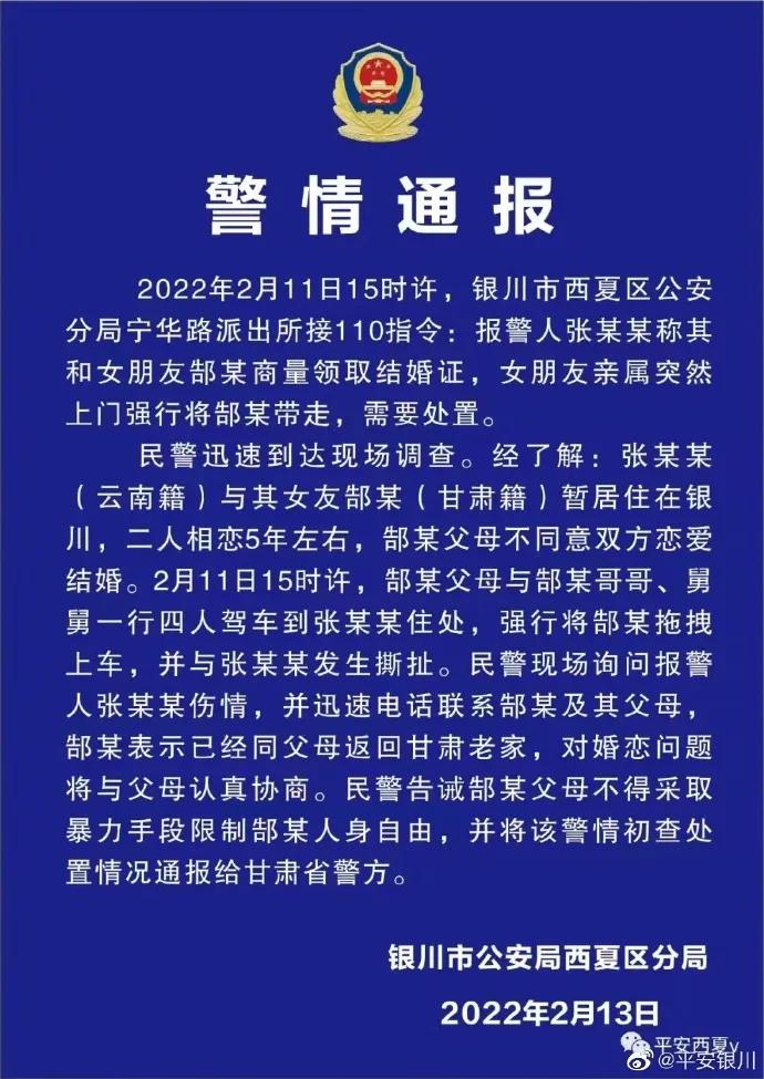 2月13日,银川妇联工作人员告诉记者,他们已关注到此事并及时跟进,经了解,当事博主已联系上女友,其女友不希望追究其家人责任,此事双方正协商处理。如果有需要,妇联可为当事人提供法律、心理咨询等方面的帮助,并可帮忙为女方父母做思想工作,但要尊重当事人的意愿。