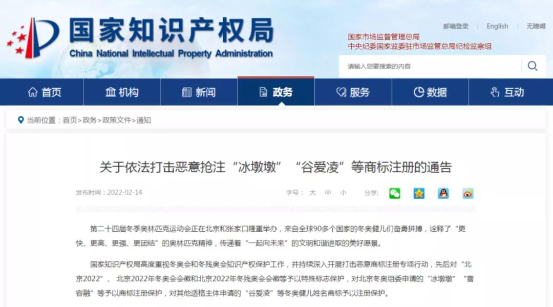 2月14日,国家知识产权局发布通告,对第41128524号“冰墩墩”、第62453532号“谷爱凌”等429件商标注册申请予以驳回;对已注册的第41126916号“雪墩墩”、第38770198号“谷爱凌”等43件商标依职权主动宣告无效。