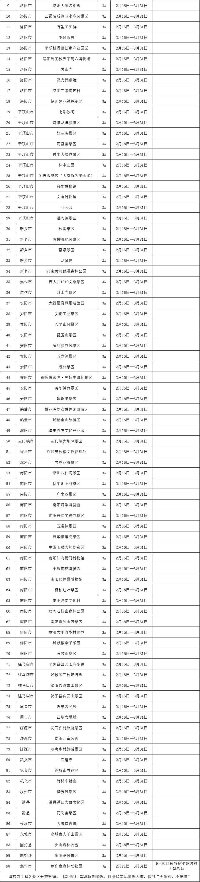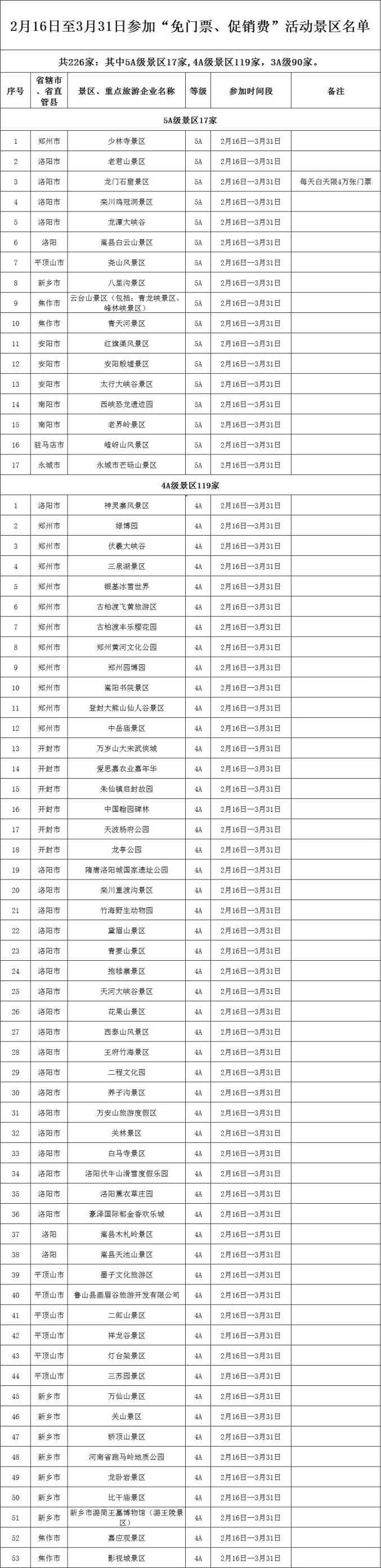 2月15日,"豫见春天·惠游老家"活动启动,河南省226家A级景区将于2月16日至3月31日、部分景区将从2月16日至5月31日面向游客免门票,部分景区免票时间长达3个半月。洛阳有38家A级景区免门票。