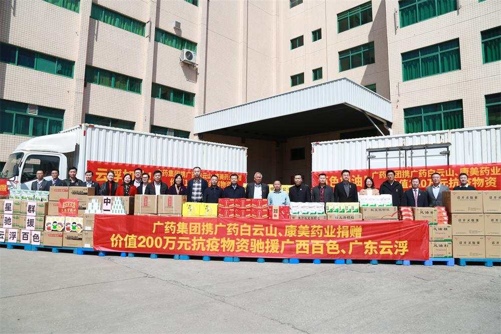 自新冠肺炎疫情发生以来,广药集团坚持“不提价、不停工,保证产品质量、保证公益为上”的“两不两保”承诺,加班生产抗病毒药物,助力建立广州市“穗康”网约口罩渠道,累计向湖北、广东、伊朗、贝宁、斐济等地捐赠药品、防护物资超2000万元,累计供应各类抗疫物资超1.2亿件。因“抗疫”表现突出,广药集团旗下广州医药股份有限公司获评“广东省抗击新冠肺炎疫情先进集体”,该公司党委获评“广东省先进基层党组织”,白云山光华公司获评“广东省新冠肺炎疫情防控物资保障工作重要贡献企业”。