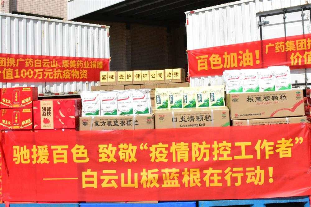 其中,广药集团旗下白云山和黄中药联合当地连锁药店,向百色捐赠一批抗疫物资,仅仅用了两天时间,就筹集了白云山复方板蓝根颗粒、感冒清热颗粒等在内的抗疫物资送往疫区。