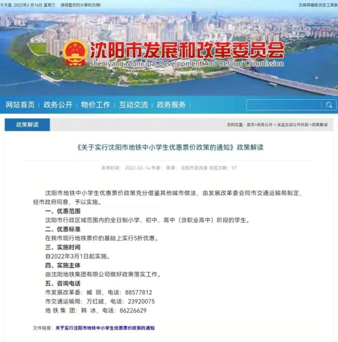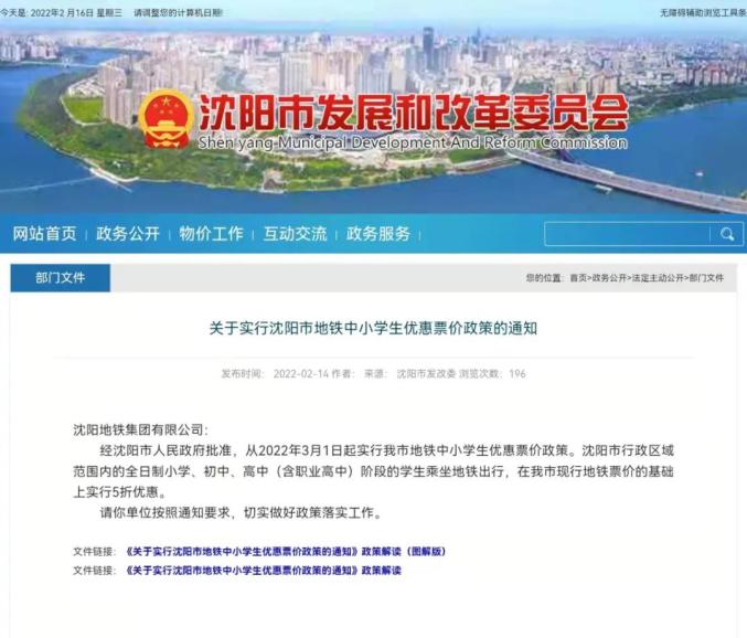 2月14日,沈阳市发改委网站发布《关于实行沈阳市地铁中小学生优惠票价政策的通知》。